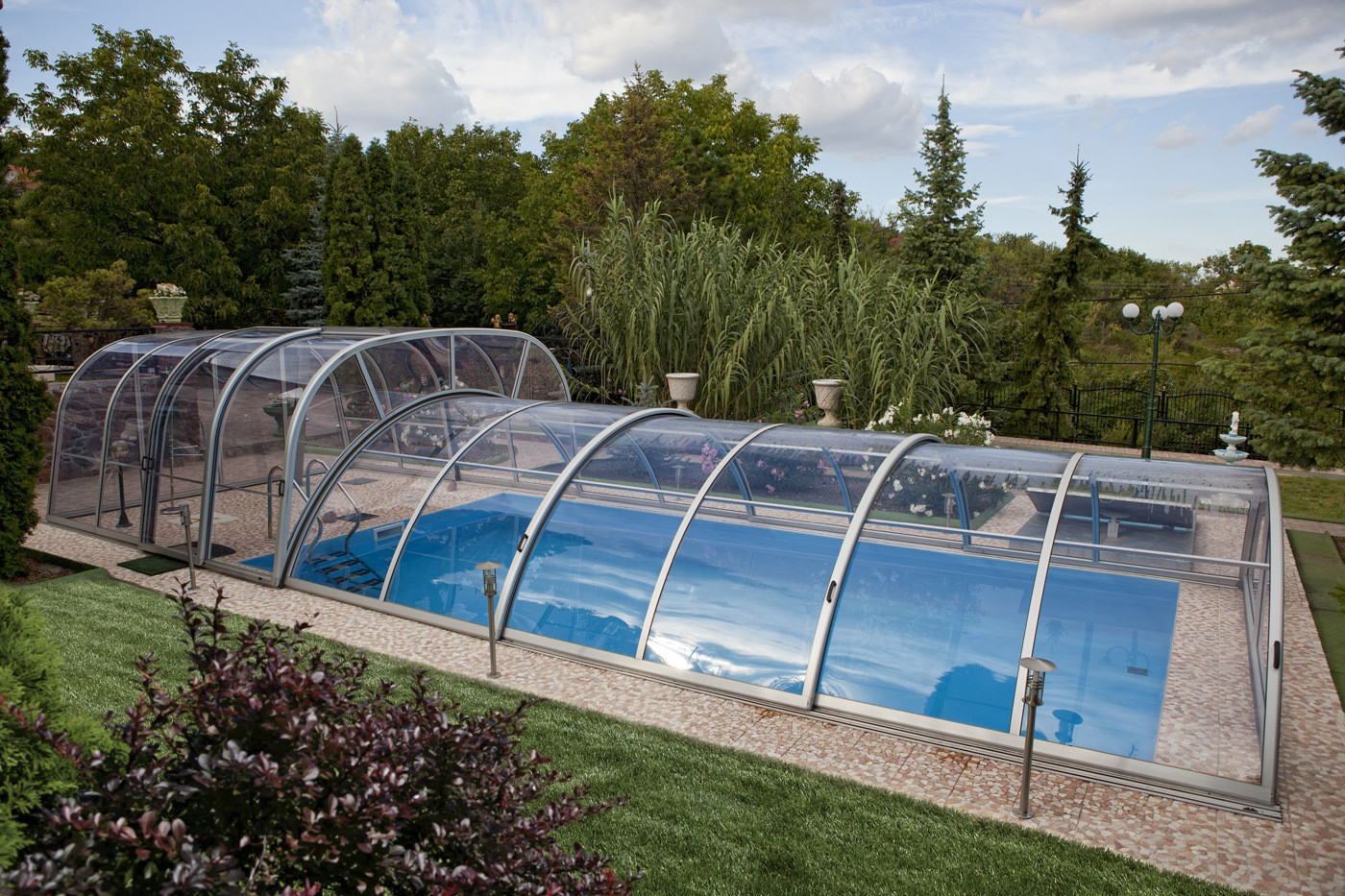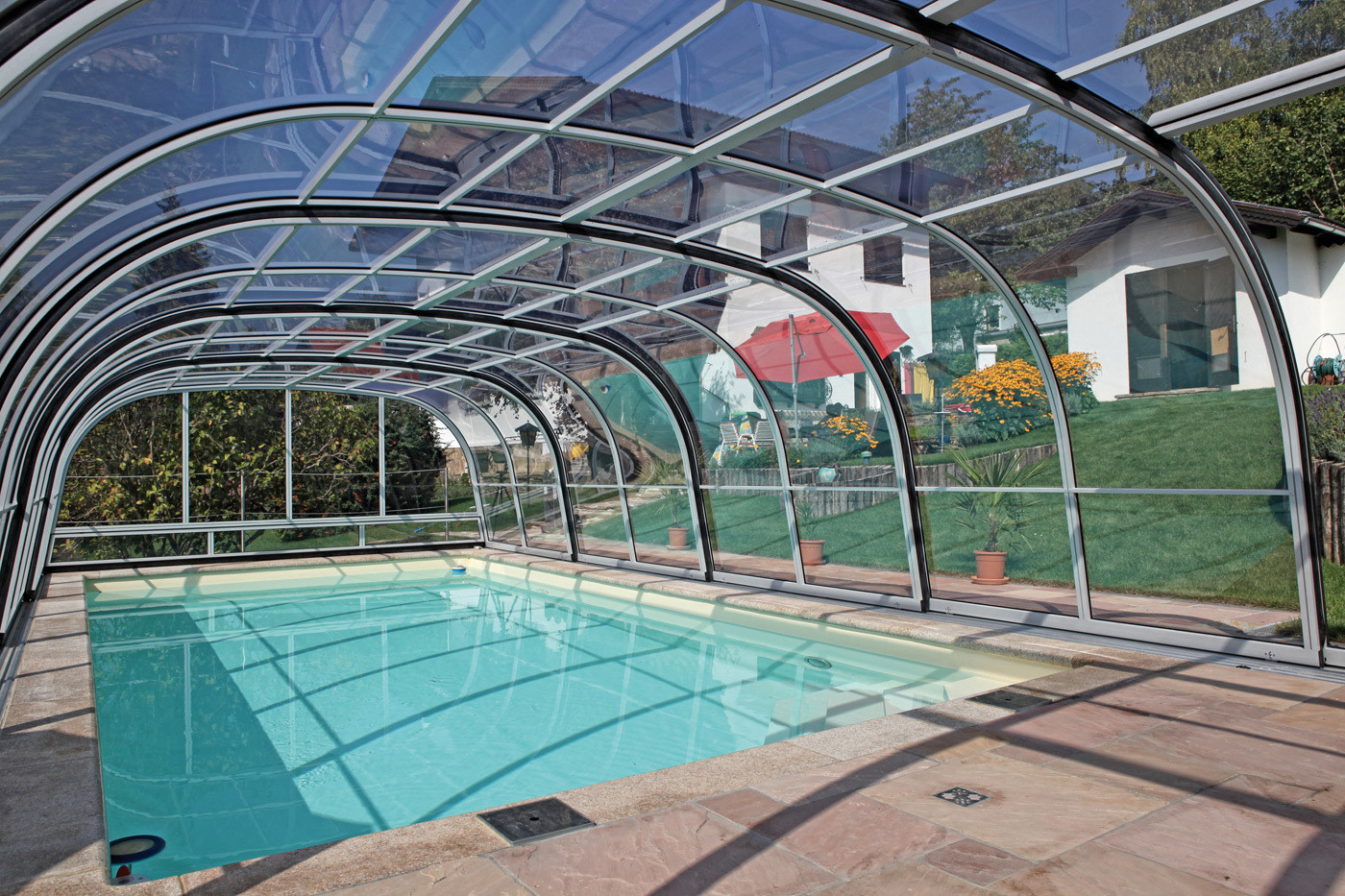 A Harmonie modellcsaládot azoknak terveztük, akik a medencefedés alatt, a fürdőzés előtt vagy után hosszabb-rövidebb időt kényelmesen szeretnének eltölteni. E típusok végfalait nyílóajtóval vagy tolóajtóval szereljük.
